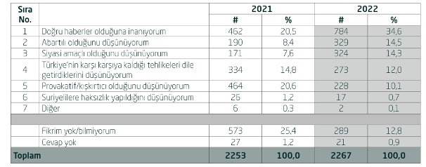 Prof. Dr. M. Murat Erdoğan’ın 2022 yılında yaptığı “Suriyeliler Barometresi” isimli araştırmasında (2022; 132) Türk toplumunun sosyal medya paylaşımları konusundaki görüşlerini anlamaya yönelik bazı sorular yöneltilmiş ve tabloda yer alan sonuçlara ulaşmıştır.