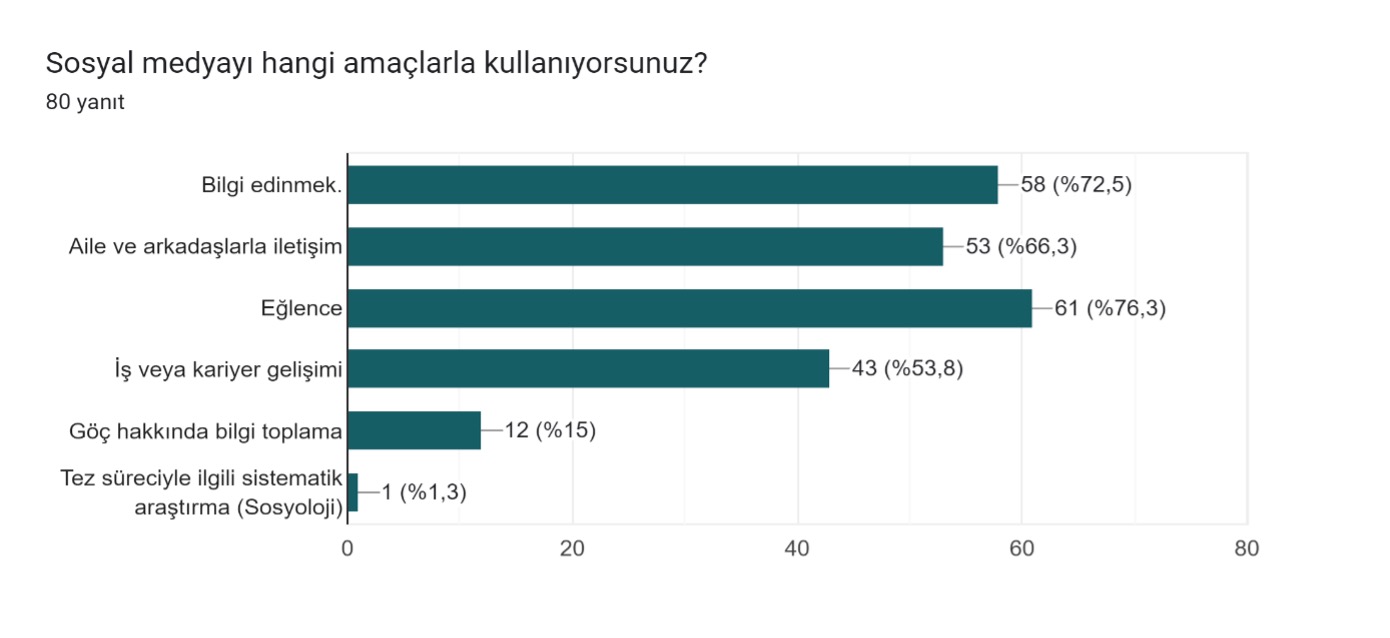 Bu cümleler konunun ve anket verilerinin bağlamı açısından oldukça önemli, dikkat edilmesi gereken detaylardır. Ulaştığım ilginç sonuçlardan birincisi; sosyal medyanın göç etme isteğini artırması ve göç etme kararını etkilemesidir. İlginç olan nokta; göçmen bireylere yönelik ötekileştirmenin ve nefret söyleminin çok açık bir şekilde yapıldığı sosyal medyanın yine de insanları göç etme konusunda etkilemesidir. Buradan vardığım sonuç; sosyal medya kullanıcılarının göç etme olgusuna karşıt bir tutumunun olmadığı ve “göçmen/göç eden” bireyin kendileri olduğu zaman göç etme eyleminin sorun olmadığı korelasyonuna ulaştım.