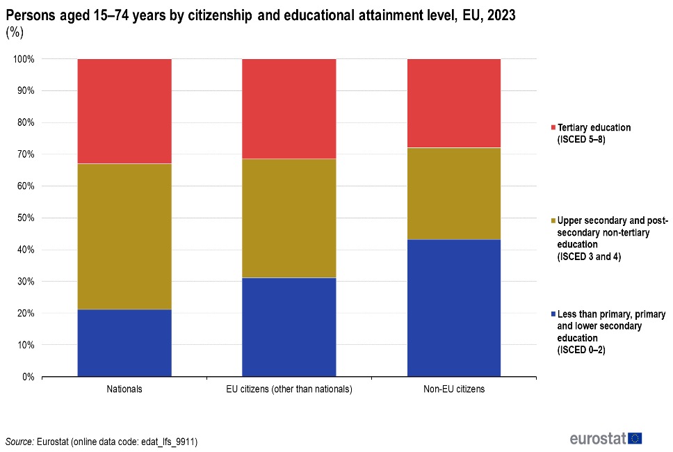 - Persons aged 15-74 years by migration status and educational attainment level, EU,2023 https://ec.europa.eu/eurostat/statistics-explained/index.php?title=Foreign-born_people_and_their_descendants_-_educational_attainment_level_and_skills_in_host_country_language